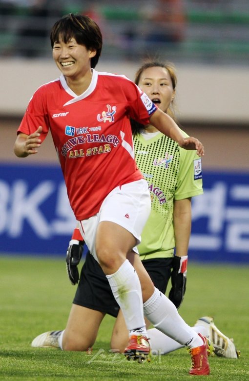 13일 충북 보은 종합운동장에서 열린 '2011 WK리그 올스타전' 가이아팀과 아테나팀의 경기에서 가이아 권하늘이 역전골, 팀의 세번째 골을 넣은 후 환호하고 있다.