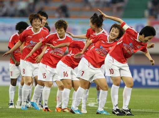 13일 충북 보은 종합운동장에서 열린 '2011 WK리그 올스타전' 가이아팀과 아테나팀의 경기에서 가이아 권하늘이 역전골, 팀의 세번째 골을 넣은 후 동료들과 댄스 세리머니를 하고 있다.