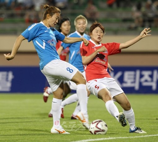 13일 충북 보은 종합운동장에서 열린 '2011 WK리그 올스타전' 가이아팀과 아테나팀의 경기에서 아테나 조소현이 가이아 김진아의 수비를 피해 돌파하고 있다.