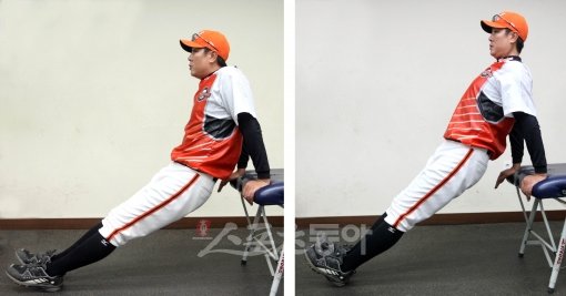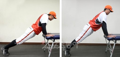 <사진 6> 걸상이나 책상을 이용해 팔꿈치가 움직이지 않도록 해야하는 것이 중요하다. 등을 쫙 편 상태에서 손과 어깨의 폭을 일정하게 유지하고 거북이 목처럼 머리가 어깨 사이에 꽉 끼는 느낌으로 내렸다 올렸다 하는 동작을 10회∼12회 반복한다.