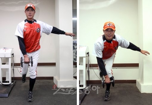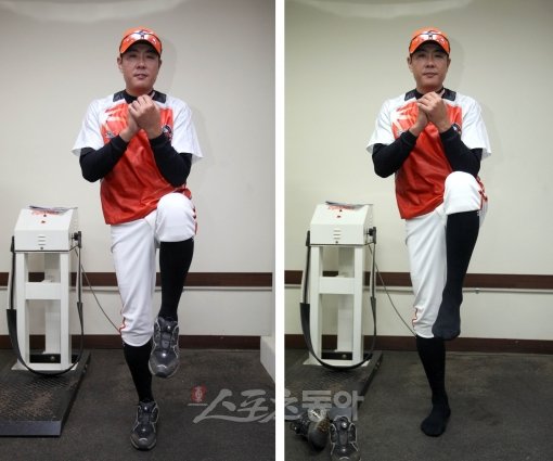 <사진1> 투구폼과 똑같은 자세로 발을 든 후(리프팅 자세) 그대로 멈춘다. 이 멈춤동작을 15∼30초 정도 2∼5회 반복한다. 처음에는 쉽지 않겠지만 조금 숙달이 되고 자신감이 생기면 눈을 감고 시도해 본다. 그리고 신발을 벗고 좋은 밸런스를 유지해보도록 하면 실전투구 때는 훨씬 안정감을 느낄 것이다.