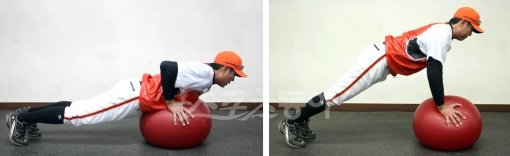 <사진 8>메디신볼을 이용하는 것이 좋다. 이 동작의 키는 밸런스와 보디 컨트롤이다. 밀어올리고 내려갈 때 균형을 잡지 못하면 공이 흔들리며 자세가 움직이게 되는데 이런 동작이 되지 않도록 하는 것이 중요하다. 10회 연속 동작이 필요하다.