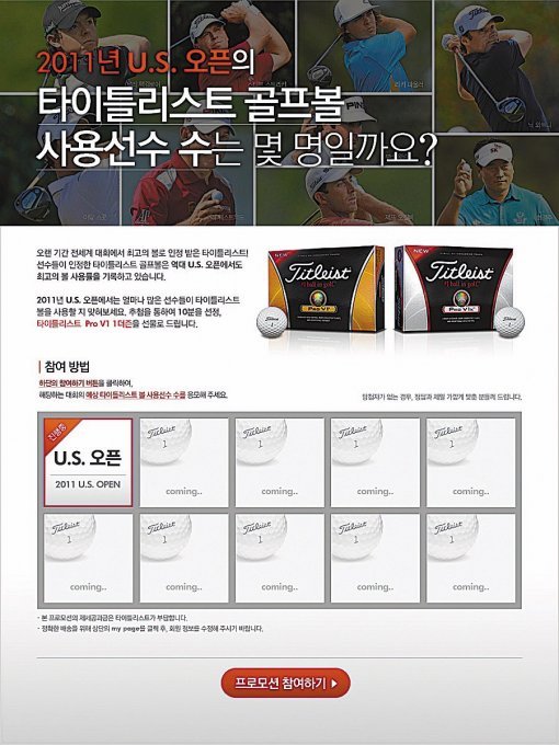 타이틀리스트(www.titleist.co.kr)가 2011년 US오픈을 맞아 온라인 이벤트(사진)를 실시한다. 오는 16일까지 타이틀리스트 매니아 사이트(mania.titleist.co.kr)에 접속해 이벤트 창에 올해의 타이틀리스트 볼 ‘예상 사용선수의 수’를 입력하면 된다. 이벤트 참여에 앞서 2009년과 2010년 US 오픈 사용선수가 힌트로 주어지며, 추첨을 통해 정답자 10명을 선정해 타이틀리스트 Pro V1 1더즌이 제공된다.
