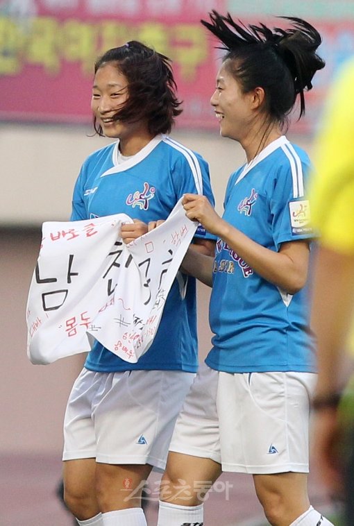 7분 뒤에는 가이아팀이 나섰다. 박희영(대교)의 동점골이 나오자 선수들은 벤치 앞으로 달려갔다. 그리고 커다란 플래카드를 펼쳤다. ‘여자축구 승부조작 NO.’ 최근 남자프로축구 K리그에 승부조작 사건이 불거졌지만 여자축구 WK리그는 깨끗하다는 것을 팬들에게 알리는 문구였다. 팬들은 선수들에게 뜨거운 격려의 박수를 아끼지 않았다.