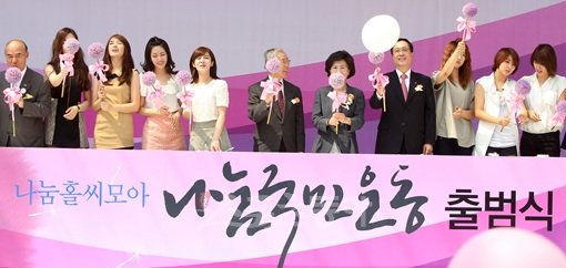 14일 서울 중구 서울광장에서 열린 '나눔 홀씨 모아' 나눔국민운동 출범식에서 진수희 보건복지부 장관, 손봉호 나눔국민운동본부 대표, 홍보대사 티아라와 포미닛 등이 나눔홀씨 확산 세리머니를 하고 있다.
