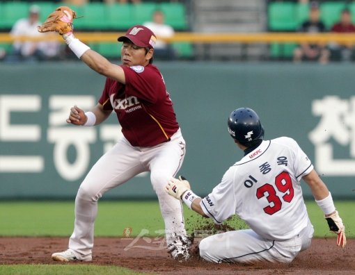 14일 서울 잠실야구장에서 열린 ‘2011 롯데카드 프로야구’ 두산과 넥센의 경기에서 3회말 무사 1루 오재원 타석때 1루 주자 이종욱이 도루에 성공하고 있다.