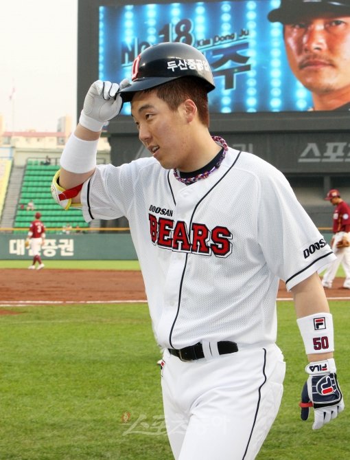 14일 서울 잠실야구장에서 열린 ‘2011 롯데카드 프로야구’ 두산과 넥센의 경기에서 1회말 무사 2, 3루 상황에 김현수가 3점 홈런을 때려낸 후 환호하는 팬들에게 인사하고 있다.