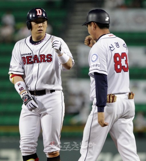 14일 서울 잠실야구장에서 열린 ‘2011 롯데카드 프로야구’ 두산과 넥센의 경기에서 6회말 두산공격 선두 타자로 나선 김현수가 1루타를 때려내고 1루 신경식 코치와 하이파이브하고 있다.