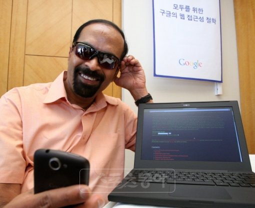 구글에서 ‘웹 접근성’ 분야를 연구하고 있는 티브이 라만(T.V. Raman)박사가 구글의 웹 및 모바일 접근성 기술을 직접 시연하고 있다.
