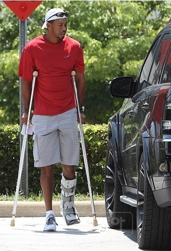 다리에 깁스를 하고 목발을 짚은 타이거 우즈가 카메라에 잡혔다. 우즈는 US오픈 결장 이유를 경미한 무릎과 아킬레스건 부상 때문이라고 밝혔지만 14일(한국시간) 공개된 사진으로 볼 때 부상이 훨씬 심각해 보인다.