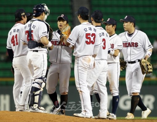 기쁜 승리지만 아무도 크게 웃지 않았다. 김경문 감독의 자진 사퇴로 필승을 다짐한 두산은 14일 잠실 넥센전에서 5-3으로 이겼다. 경기 직후 선수들이 마운드에 모여 담담한 표정으로 서로를 격려하고 있다.