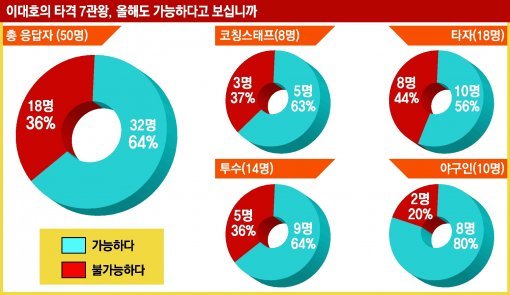 응답자를 코칭스태프, 선수, 야구인 등 세 집단으로 나눴을 때 코칭스태프는 63%(8명중 5명), 선수는 59%(32명 중 19명), 야구인은 80%(10명 중 8명) 비율로 이대호의 7관왕 재등극이 충분히 가능하다고 예상했다. 선수를 투수와 타자로 나눠 보면, 이대호와 같은 타자(56%·18명 중 10명)보다 이대호를 상대하는 투수(64%·14명 중 9명)쪽에서 그 가능성을 높게 보고 있다는 결과가 이채로웠다.