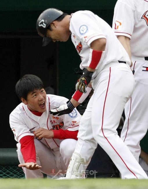 ‘김광현표 하이파이브.’ SK 김광현(왼쪽)이 15일 문학 롯데전 박재상이 2회 2사 후 선제솔로홈런을 날린 후 덕아웃으로 들어오자 주저앉아 하이파이브를 요청하고 있다. 김광현의 표정이 익살스럽다.