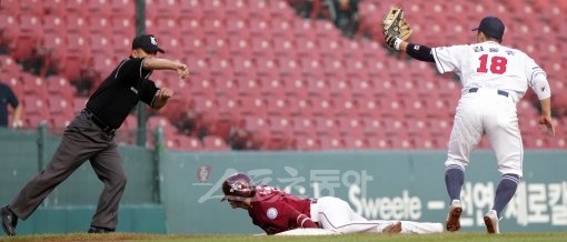 16일 서울 잠실야구장에서 열린 ‘2011 롯데카드 프로야구’ 두산과 넥센의 경기에서 2회초 넥센공격 1사 2루 장기영 타석때 2루 주자 김민우가 3루 도루에 실패하고 있다.