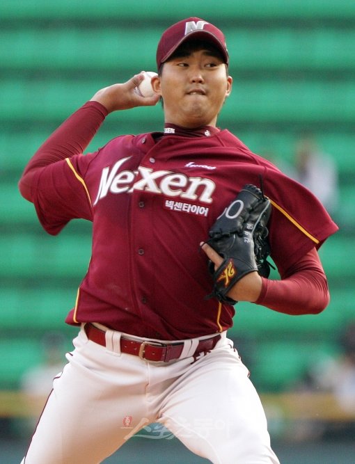 15일 서울 잠실야구장에서 열린 ‘2011 롯데카드 프로야구’ 두산과 넥센의 경기에서 넥센 선발 김영민이 역투하고 있다.