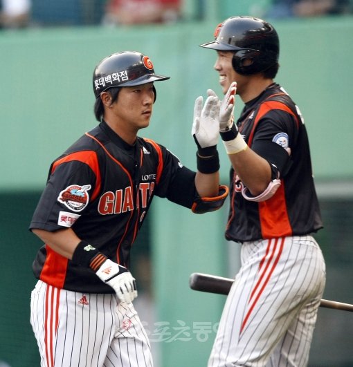 롯데 정훈(왼쪽)이 16일 문학 SK전 1-0으로 앞선 2회초 무사 1·2루에서 매그레인을 상대로 좌월 3점 홈런을 때린 뒤 전준우와 하이파이브를 하고 있다. 문학 | 김종원 기자 won@donga.com 트위터 @beanjjun