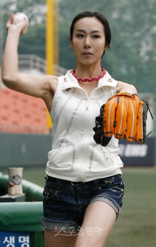 17일 서울 목동야구장에서 열린 프로야구 롯데 자이언츠와 넥센 히어로즈의 경기에전에 시구자로 나선 모델 겸 방송인 이화선이 연습을 하고 있다.
