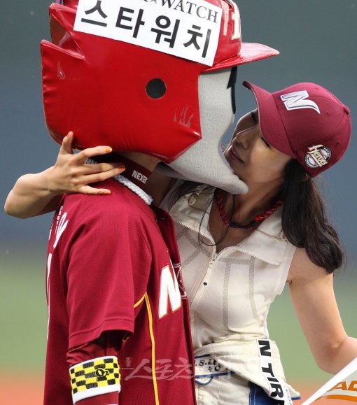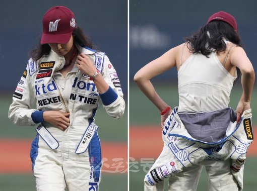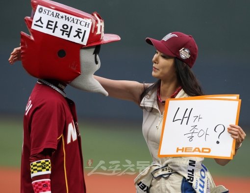 17일 서울 목동야구장에서 열린 프로야구 롯데 자이언츠와 넥센 히어로즈의 경기에서 모델 겸 방송인 이화선이 시구한 후 상의를 내리고 있다.