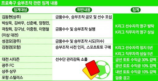 한국프로축구연맹은 17일 서울 신문로 축구회관에서 상벌위원회를 열고 최근 일어난 승부 조작에 관련된 선수와 구단에 대한 징계를 확정했다. 11명의 선수 가운데 10명에게는 ‘K리그 선수 자격 영구 박탈’이라는 가장 무거운 징계가 내려졌다.