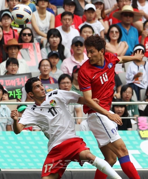 19일 오후 서울 월드컵경기장에서 열린 2012 런던올림픽 축구 아시아 예선 1차전 대한민국과 요르단 경기에서 전반전 대한민국 지동원이 상대 수비수와 공중볼을 다투고 있다.