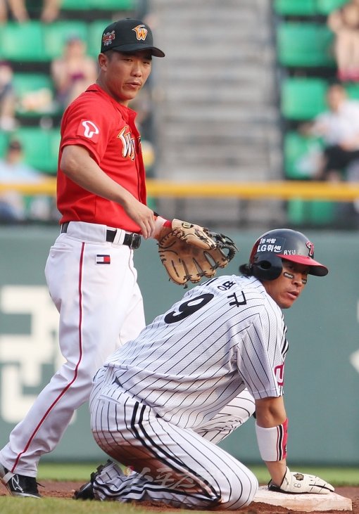 19일 서울 잠실야구장에서 열린 프로야구 SK 와이번스와 LG 트윈스의 경기에서 4회말 LG 공격 무사 1루, 주자 이병규가 박용택 내야 땅볼 때 포스아웃된 후 1루를 바라보고 있다.