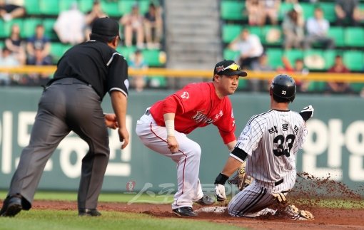 19일 서울 잠실야구장에서 열린 프로야구 SK 와이번스와 LG 트윈스의 경기에서 4회말 LG 공격 2사 1루 주자 박용택이 정성훈 타석 때 2루 도루에 실패하고 있다.