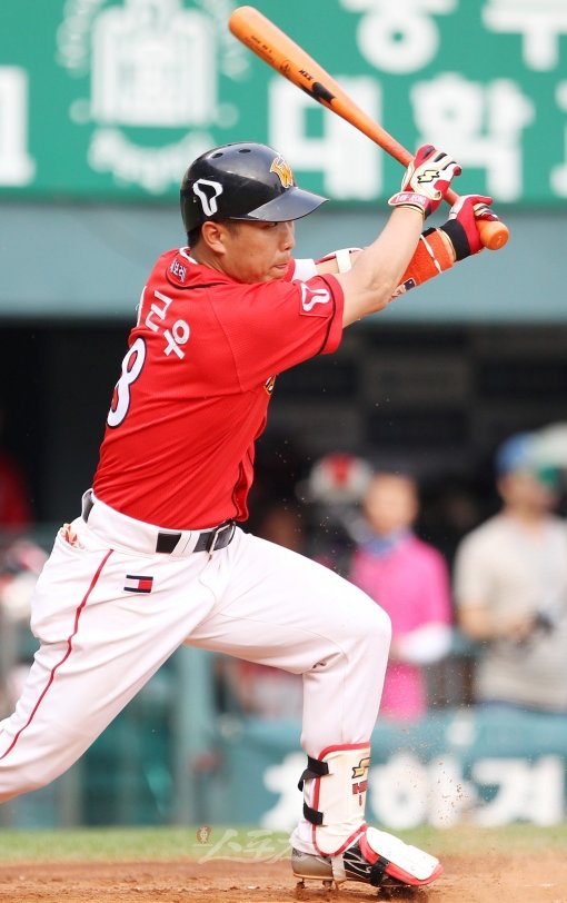 19일 서울 잠실야구장에서 열린 프로야구 SK 와이번스와 LG 트윈스의 경기에서 1사 만루상황에서 SK 정근우가 1타점 적시타를 치고 있다.