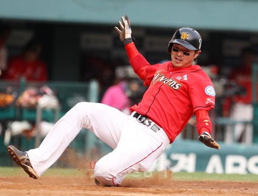 19일 서울 잠실야구장에서 열린 프로야구 SK 와이번스와 LG 트윈스의 경기에서 1사 만루상황에서 SK 정근우가 1타점 적시타로 3루 주자 임훈이 홈으로 슬라이딩하고 있다.