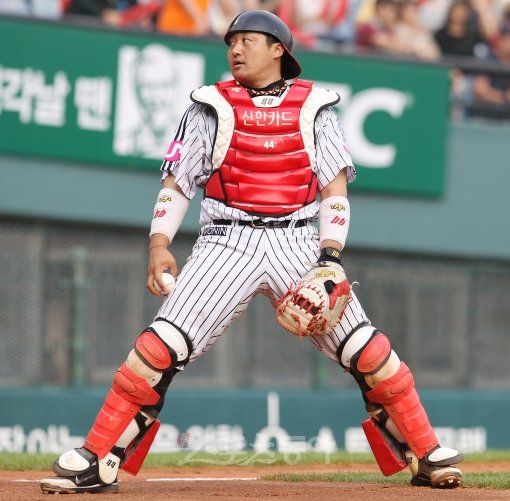 19일 서울 잠실야구장에서 열린 프로야구 SK 와이번스와 LG 트윈스의 경기에서 5회초 SK 공격무사 1루 LG 포수 조인성이 임훈의 번트 타구를 놓치자 아쉬워하고 있다.