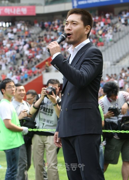 19일 오후 서울 상암월드컵경기장에서 열린 올림픽대표팀과 요르단의 런던올림픽 아시아 예선경기에서 임재범이 국민의례때 애국가를 열창하고 있다.