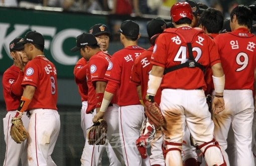 19일 서울 잠실야구장에서 프로야구 SK 와이번스와 LG 트윈스의 경기가 열렸다. 6대 2로 승리한 SK선수들이 경기 종료 후 기쁨을 나누고 있다.