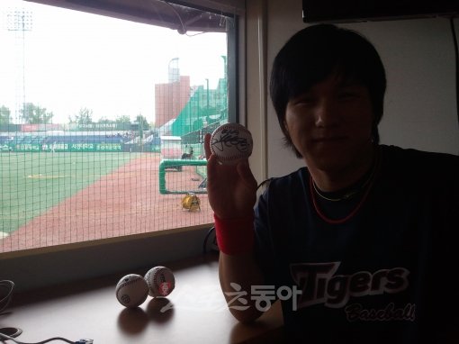 김선빈이 직접 뽑은 팬 3명에게 선물할 사인볼을 들고 기분 좋게 웃고 있다.