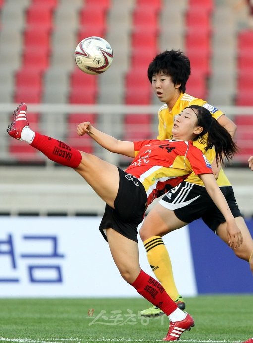 서울시청 정영아(왼쪽)가 20일 고양종합운동장에서 열린 WK리그 정규리그 스포츠토토와의 경기에서 상대 선수에 앞서 볼을 걷어내고 있다.