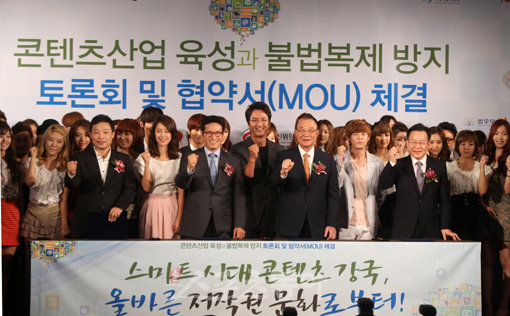 22일 오후 서울 63빌딩컨벤센센터 주니퍼룸에서 '콘텐츠산업 육성과 불법복제 방지 토론회 및 MOU체결식'이 열렸다. 곽승준 대통령직속 미래기획위원회 위원장, 정병국 문화체육관광부 장관, 최시중 방송통신위원회 위원장 등 이 콘텐츠 산업육성과 불법 복제 방지를 위한 MOU 체결에 서명한 후 대중예술인과 기념 촬영을 하고 있다.