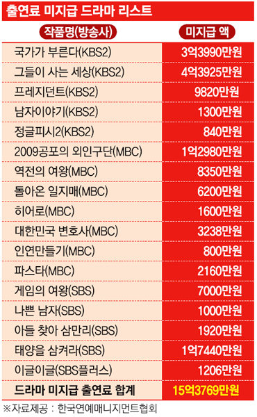 연매협이 공개한 자료에 따르면 출연료 미지급 드라마는 ‘그들이 사는 세상’ ‘프레지던트’ ‘역전의 여왕’ ‘히어로’ ‘파스타’ ‘나쁜남자’ ‘태양을 삼켜라’ 등 15편이다. 방송사별로는 KBS가 방송한 드라마가 5편(8억9875만1000원)으로 가장 많았다. MBC 방송 드라마는 7편(3억5천328만원)이었고 SBS 방송 드라마는 4편(2억7360만7948원)이었다. 이와 함께 ‘걸프렌즈’와 ‘하녀’ ‘황해’ ‘영화는 영화다’ 등 15편의 영화도 일부 출연료를 지급하지 못했다.