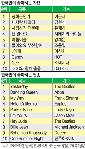 한국 라디오 청취자들이 가장 선호하는 가요를 조사한 결과 이문세의 ‘광화문 연가’로 나타났다. 팝음악으로는 비틀스의 명곡 ‘예스터데이’가 1위로 꼽혔다.