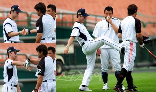 22일 저녁 부산 사직야구장에서 열린 프로야구 롯데와 두산의 경기에서 두산 전재춘 트레이너가 롯데 홍성흔과 함께 두산 시절 홈런 세레모니로 인사를 한 후 킥으로 인사를 마무리하고 있다.