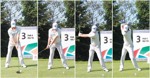 1. 교과서적인 어드레스 자세다. 특유의 유연함을 바탕으로 경직된 부분을 찾아볼 수 없을 만큼 충분히 이완되어 있다.2. 몸통과 팔이 일치된 상태로 백스윙 톱을 향해 가고 있다. 몸통과 팔이 일체되게 움직여야 실수를 최소화 할 수 있다.3. 오른쪽 다리가 견고하게 축을 이루며 체중이동이 되고 있다. 왼쪽 무릎도 무너지지 않고 유지되고 있다.4. 매킬로이의 몸이 얼마나 유연한지 확인할 수 있는 백스윙 톱 자세다. 특히 상체 회전은 90도를 넘어 110도에 가깝다. 엄청난 파워의 응축이다.5. 임팩트 직전까지 손목 코킹을 유지하며 클럽을 끌어내리고 있다. 아마추어는 흉내 내기 어려운 자세다. 매킬로이의 스윙 스피드는 무려 193km에 이른다.6. 왼다리가 견고하게 축을 이루며 임팩트를 하고 있다. 왼팔이 몸에 붙어 내려오는 자세도 눈여겨보자. 시선은 볼에 고정되어 있다.7. 임팩트 이후에는 모든 근육의 힘을 풀어주며, 자연스럽게 클럽을 타깃 방향으로 던져주고 있다. 이 역시 올바른 방향성과 비거리의 원천이다.8. 엄청난 스윙 스피드로 스윙을 마쳤지만, 피니시 자세에서는 조금의 흐트러짐도 없다. 유연성과 밸런스, 스윙 리듬이 조화를 이뤄야 가능한 자세다.