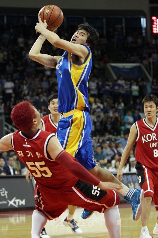 26일 오후 3시 서울 잠실학생체육관에서 1990년대 대학농구의 전성시대를 이끈 양대 산맥 고대-연대 농구 OB팀 추억을 라이벌 전을 가졌다. 연대 정재근이 고대 김기만의 마크를 피해 슛을 시도하고 있다.
