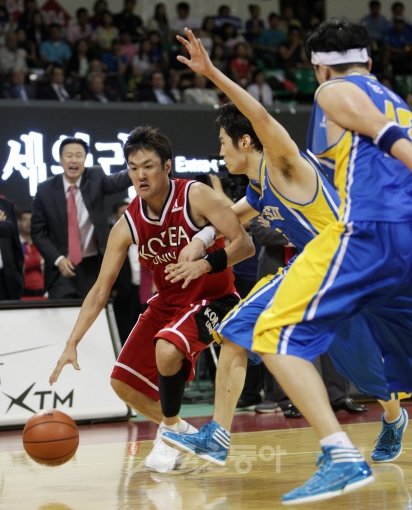 26일 오후 3시 서울 잠실학생체육관에서 1990년대 대학농구의 전성시대를 이끈 양대 산맥 고대-연대 농구 OB팀 추억을 라이벌 전을 가졌다. 고대 김병철이 상대 수비수를 피해 공격하고 있다. 잠실실내체 | 임진환 기자 photolim@donga.com 트위터 @binyfafa