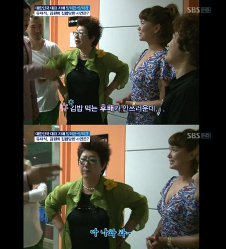 양희은을 본 유재석과 김원희, 이하늘는 깜짝 놀라 대기실 밖으로 나갔다. 이에 양희은은 "다 나와봐"라고 큰소리 치며 웃음을 자아냈다.