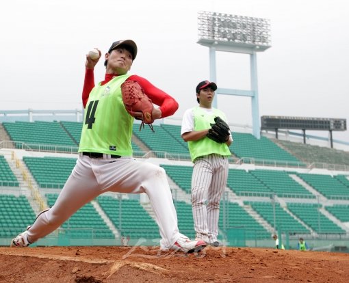 경남 창원시를 연고로 한 프로야구 제9구단인 ‘엔씨소프트 다이노스’의 1차 트라이아웃(사전 테스트)이 28일 마산야구장에서 열렸다. 투수조 양락천이 역투하고 있다.