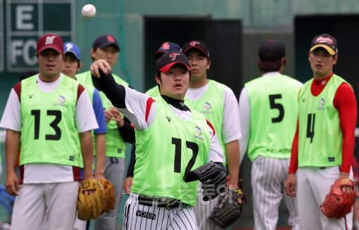 경남 창원시를 연고로 한 프로야구 제9구단인 ‘엔씨소프트 다이노스’의 1차 트라이아웃(사전 테스트)이 28일 마산야구장에서 열렸다. 몸을 푸는 선수들의 다양한 구단 모자가 눈길을 끈다.