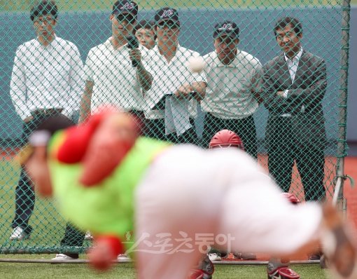 경남 창원시를 연고로 한 프로야구 제9구단인 ‘엔씨소프트 다이노스’의 1차 트라이아웃(사전 테스트)이 28일 마산야구장에서 열렸다. 투수조의 역투를 지켜보고 있는 이상구 단장의 눈초리가 매섭다.