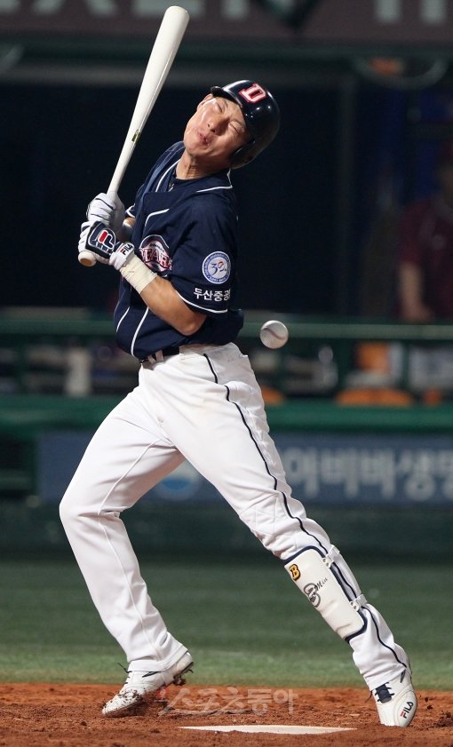 28일 서울 목동야구장에서 열린 프로야구 두산 베어스와 넥센 히어로즈의 경기에서 5회초 두산 1사 1,3루 두산 고영민이 몸에 볼을 맞은 후 고통스러워 하고 있다.