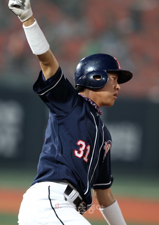28일 서울 목동야구장에서 열린 프로야구 두산 베어스와 넥센 히어로즈의 경기에서 5회초 두산 공격, 5회초 두산 공격, 2사 1,2루 두산 정수빈이 스리런을 날린 후 그라운드를 돌고 있다.