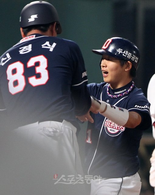 28일 서울 목동야구장에서 열린 프로야구 두산 베어스와 넥센 히어로즈의 경기에서 5회초 두산 공격, 5회초 두산 공격, 2사 1,2루 두산 정수빈이 스리런을 날린 후 홈인해 신경식 코치와 하이파이브하고 있다.