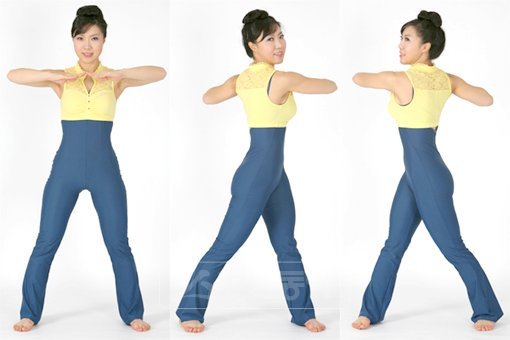 1. 양발을 어깨너비보다 넓게 벌리고 양팔과 양손은 가슴 앞에 마주한다.