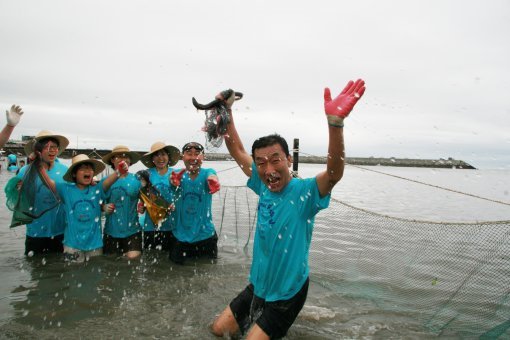 수협은행이 개최한 ‘사랑海썸머페스티발’ 참가자들이 바다체험을 하며 즐거워하고 있다.
