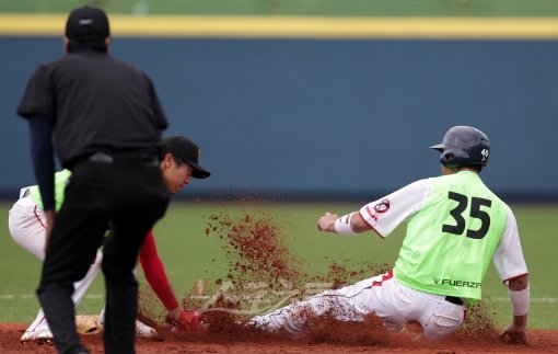경남 창원시를 연고로 한 프로야구 제9구단인 '엔씨소프트 다이노스'의 1차 트라이아웃(사전 테스트)이 29일 마산야구장에서 전날에 이어 열렸다. 이날 오후에 열린 홍백평가전에서 35번 강병수가 도루에 성공하고 있다.